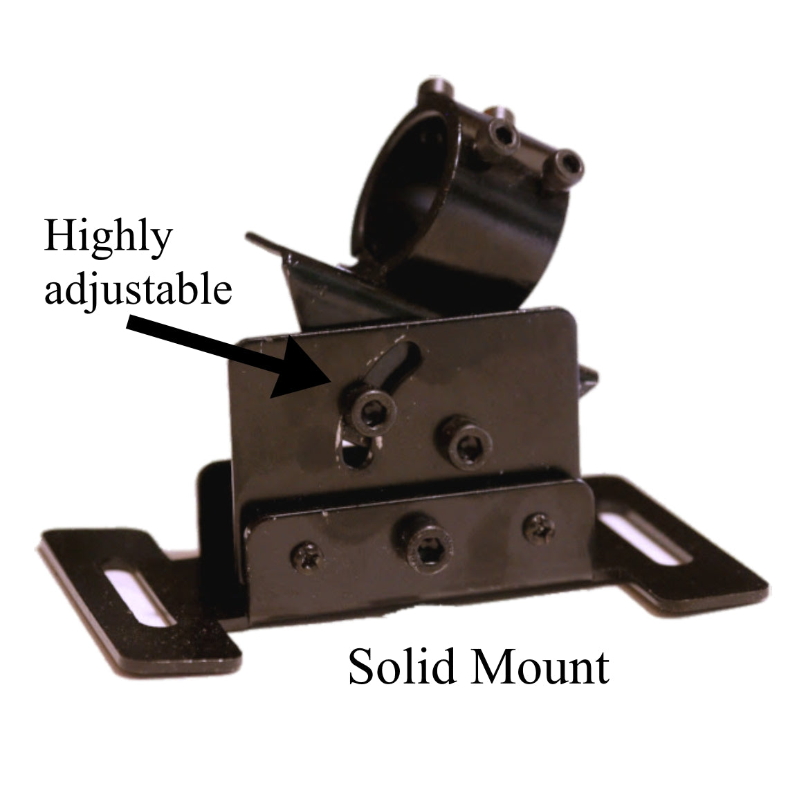 The robust, heavy-duty mounting system makes setup simple. It's easily adjustable and locks firmly in place with Allen wrenches. The rectangular base with mounting slots allows for quick and secure bolting onto any surface.